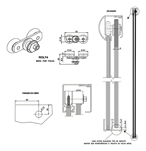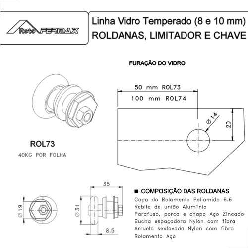 Roldana Dupla Kmp Nylon 30mm Vidro Temperado 8/10mm Janelas E Box