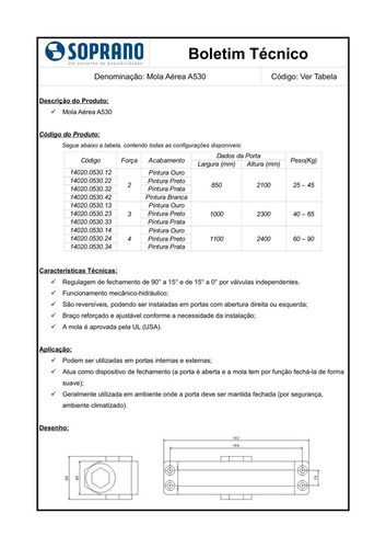 A Mola Aérea Hidráulica Porta 60kg a 90kg Força 4 F4 Soprano A530-F4 é a solução ideal para quem busca eficiência e robustez em sistemas de suspensão. Com uma capacidade de suporte que varia entre 60 kg e 90 kg, este produto é projetado para atender às necessidades de diversos projetos, garantindo segurança e estabilidade. – Nível de Força F4 – Para dimensões de até 2300 x 1000mm (230 x 100cm) e peso de 60 a 90Kg – Regulagem de fechamento de 90º a 15º e de 15º a 0º por válvulas independentes; – Utilização reversível, podendo ser instaladas em portas com abertura direita ou esquerda Fabricado pela marca Soprano, a mola apresenta um acabamento em prata que combina durabilidade e estética. Seu design foi pensado para proporcionar um desempenho superior, mesmo em condições desafiadoras, assegurando que você tenha a confiança necessária em cada utilização. Embora não possua velocidade regulável, a Mola Aérea Hidráulica F4 é perfeita para aplicações que exigem um funcionamento constante e confiável. Ideal para profissionais e entusiastas que valorizam a qualidade e a performance em seus trabalhos, este produto se destaca pela sua resistência e confiabilidade. A Mola Aérea Hidráulica Soprano é optar por um produto que alia tecnologia e tradição, garantindo resultados satisfatórios em cada projeto. Invista na qualidade e na segurança que sua obra merece com a Mola A530-F4.