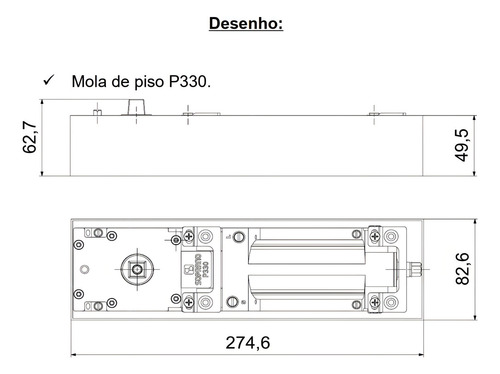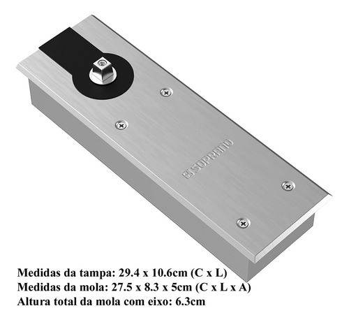 Verifique as especificações técnicas do produto com atenção antes de realizar sua compra. Leia o manual do produto antes de utilizá-lo. Se necessário, procure ajuda de um profissional para uma perfeita instalação do produto. Atenção: verifique as medidas do produto nas imagens do anúncio e confirme se as medidas do mesmo são compatíveis com o local onde a mola será instalada e com a porta que será instalada. Certifique-se que a mola esteja alinhada com o chão no momento da instalação. Especificações Técnicas: – Funcionamento misto mecânico/hidráulico. – Com trava mecânica em 90º (mantém porta aberta) se necessário. – Regulagem de fechamento de 115° a 15° e de 15° a 0° por válvulas independentes. – Potência ajustável força de 1 a 4 (portas até 120kg). – Portas até de 120kg totais com 2.1m (210cm) de altura x 1.1m (110cm) de largura. – Atua como dispositivo de fechamento (a porta é aberta e a mola tem por função fechá-la de forma suave). – Eixo tipo Santa Marina (SM): portas de vidro. – Pode ser utilizada em portas de internas e externas (eixo reversível). – Produto instalado dentro do chão. – Já lubrificada para funcionamento. – Acabamento em inox escovado. – Mola homologada pela UL (USA). – Medidas: verifique as imagens no anúncio. – Peso aproximado: 3.4kg. – Cor: prata blidex. – Modelo: mola de piso para portas de vidro tipo Santa Marina P330. – Marca: Soprano. Descrição Detalhada: Geralmente utilizada em ambiente onde a porta deve ser mantida fechada (por segurança, ambiente climatizado). Mola Soprano P330 para instalação em portas de vidro. Com um funcionamento misto mecânico/hidráulico para uma abertura e fechamento mais suave. Possui trava mecânica em 90º (porta aberta)e regulagem de fechamento de 115° a 15° e de 15° a 0° por válvulas independentes. Suporta portas até 120kg (potência de 1 a 4) com largura de 1.1m e altura de2.1m (medidas aproximadas). Eixo fixo Santa Marina (SM) e pode ser utilizada em portas internas e externas. Acabamento de alta qualidade em inox escovado. Conteúdo da embalagem: – 1 Mola Soprano P330. – 1 Kit de suporte de instalação. – 1 Manual de instruções. – 1 Gabarito.